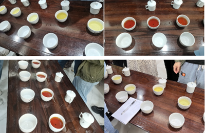 西南大学茶学系专家评审团主要由丁阳平老师、孙康老师、罗理勇老师、袁连玉老师、岳川老师、陈应娟老师组成。在审评过程中,同学们积极探究做茶工艺对成品茶质的影响。例如,他们研究了摇青次数、时间以及方式对乌龙茶香气的影响,发酵温度对红茶品质的影响,揉捻时间对叶底干茶的影响,杀青温度对绿茶香气的影响等专业问题。专家老师们凭借专业知识对这些问题进行了解答,同学们从中获益匪浅。此外,老师们通过审评同学们做的茶,发现同学们存在的问题,并提出改进措施。