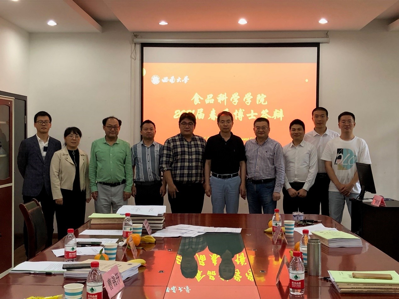 按照博士学位学位答辩程序,首先由学生进行论文陈述,包括选题、创新点以及存在不足,然后由答辩委员会委员根据学生论文写作状况进行评价。第一组答辩研究方向围绕肉产业、果胶产业进行,其中通过天然抗氧化剂干预丙二醛诱导氧化途径抑制蛋白质氧化从而改善兔肉的保鲜与精深加工技术研究、深入探究蛋白氧化对肉制品保水能力的影响等课题,能够有效提高肉品行业的经济效益,课题还为重庆西部建设提供了新的想法和途径。第二组答辩研究方向围绕食品中的功能成分进行,研究了KGM调节胃肠全段微环境、CsPUPs对茶树咖啡碱转运的影响、复合蔬菜酵素对健康青年肠道代谢的影响等内容,围绕食品营养与健康进行了探究,进一步明确了其影响及作用机理。