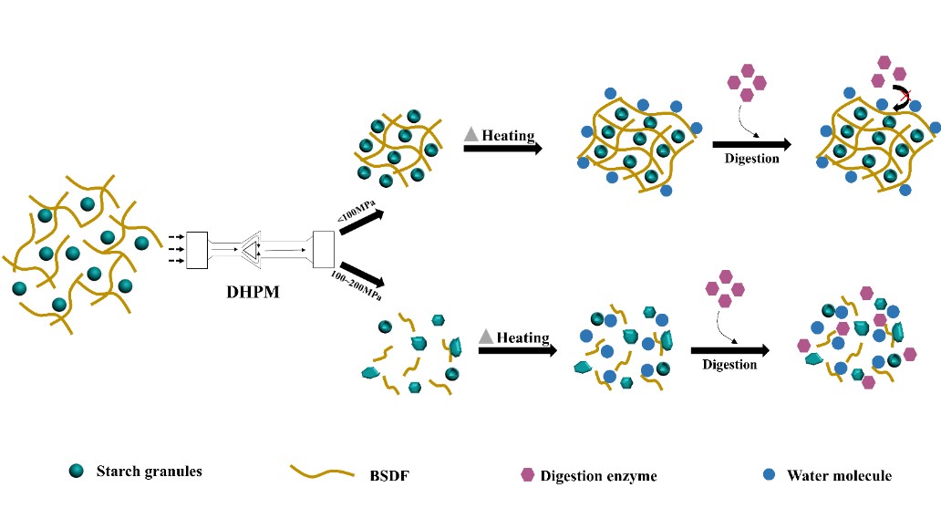 研究团队在前期研究中发现,BSDF与淀粉分子通过分子内和分子间氢键相互作用形成紧密的蜂窝状多孔结构。同时,在动态高压微射流(DHPM)加工过程中,淀粉和BSDF分子重排形成有序的复杂结构,无定型区和α-1,6糖苷键被破坏。淀粉颗粒嵌入到BSDF网络结构中。在糊化过程中,BSDF形成的屏障抑制了淀粉颗粒的膨胀和崩解,致密的屏障结构抑制了淀粉酶对淀粉的水解,降低了淀粉的消化程度和速率。然而,在100-200MPa压力下DHPM的强机械力破坏了淀粉与BSDF之间的相互作用,有序的网络结构被破坏。该部分研究成果在食品国际期刊《Food Chemistry》、《LWT-Food Science and Technology》在线发表(Food Chemistry, 2021, 350, 128724LWT-Food Science and Technology, 2020, 129: 109509)。