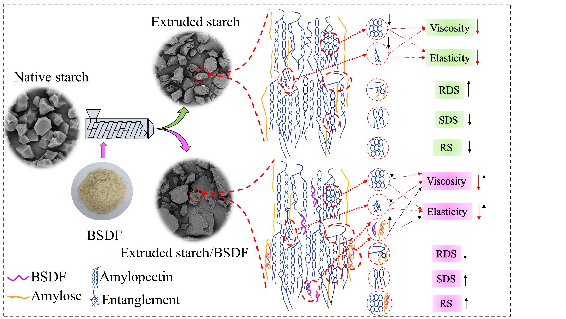 1 挤压加工过程中BSDF调控淀粉性能的机制示意图