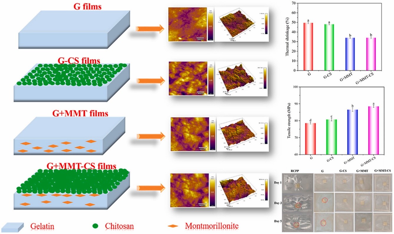 近日,该团队通过引入蒙脱土和自组装壳聚糖对明胶膜的热稳定性和亲水性能进行调控和改善,取得重要进展。相关研究以论文“Improved properties of gelatin films involving transglutaminase cross-linking and ethanol dehydration: The self-assembly role of chitosan and montmorillonite”发表在SCI一区期刊Food Hydrocolloids