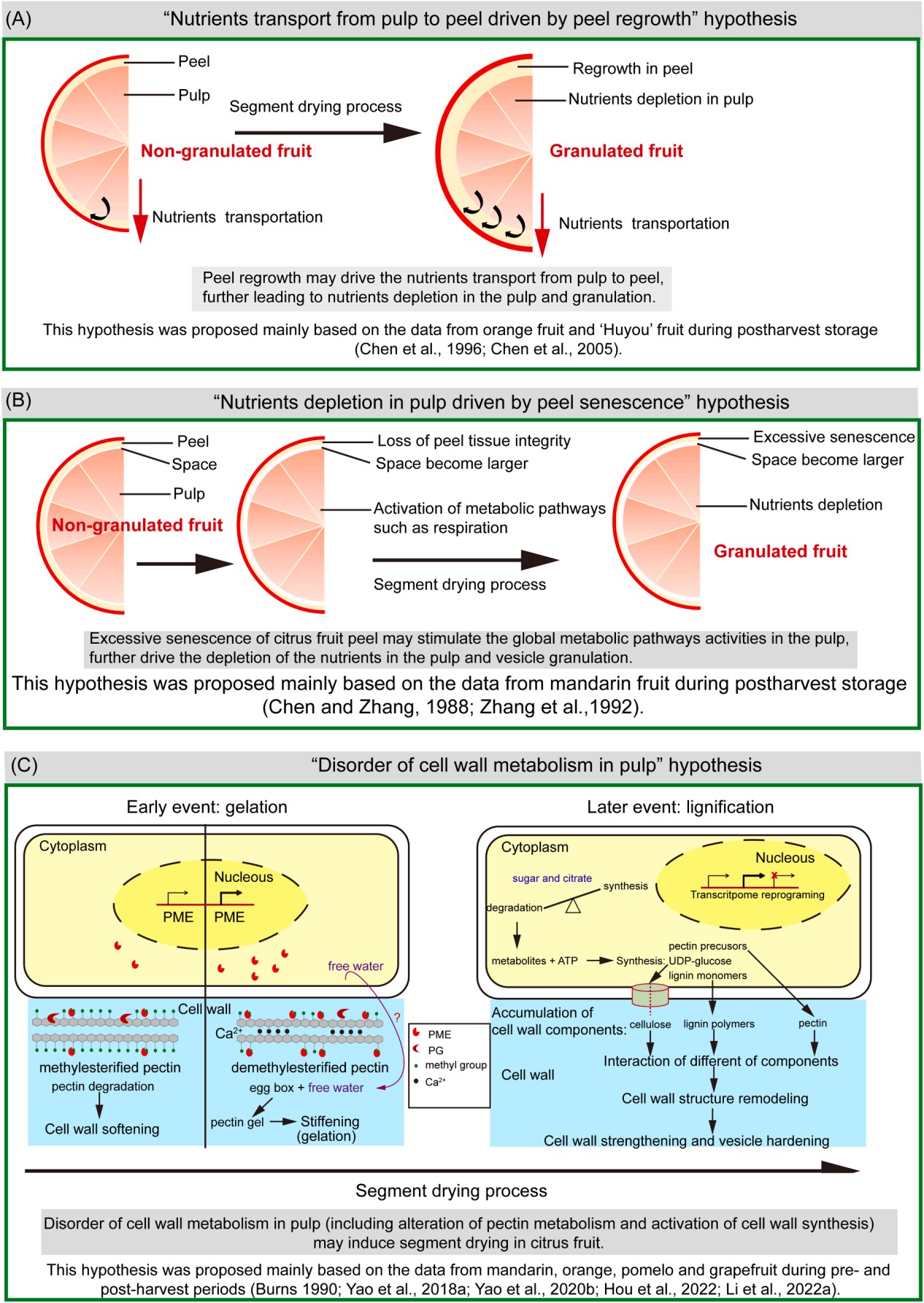 柑橘近90年的研究历史中,曾先后提出三个重要假说,探讨柑橘枯水的发生机制。浙江大学陈昆松等提出果皮相对再生长假说;枯水进程中,果皮存在二次生长现象,可能驱动果肉营养物质运输至果皮,最终消耗了果肉营养物质,诱发果肉枯水(图3A)。西南大学张百超(原西南农业大学食品学科创始人之一)等提出果皮过度衰老假说;枯水进程中,柑橘果皮存在过度衰老的现象,果皮结构疏松,诱导果肉和果皮分离,果实内部通气空间增大,促进果实整体代谢加强,最终诱导果肉糖酸消耗和枯水(图3B)。目前既有支持,也有不支持这两个假说的生理证据;同时,大量柑橘在枯水进程中,并未发现果皮特征出现明显的变化。这些都反映了柑橘枯水这一生理性病害发生机制的高度复杂性。西南大学姚世响等长期从事柑橘采后生理学研究,从大量柑橘枯水生理实验的相关性证据凝练了枯水发生的可能机制,提出了细胞壁代谢紊乱诱导柑橘枯水假说(图3C)。果胶代谢紊乱是早期事件,可能参与诱发枯水晚期事件,即纤维素和木质素等细胞壁物质大量合成,最终导致柑橘糖酸耗竭和汁胞枯水。该假说能很好解释目前柑橘枯水的生理数据,同时得到不同柑橘品种、不同实验条件下所得证据的支持。此外,该假说也为柑橘枯水的分子机制研究奠定了概念性基础。