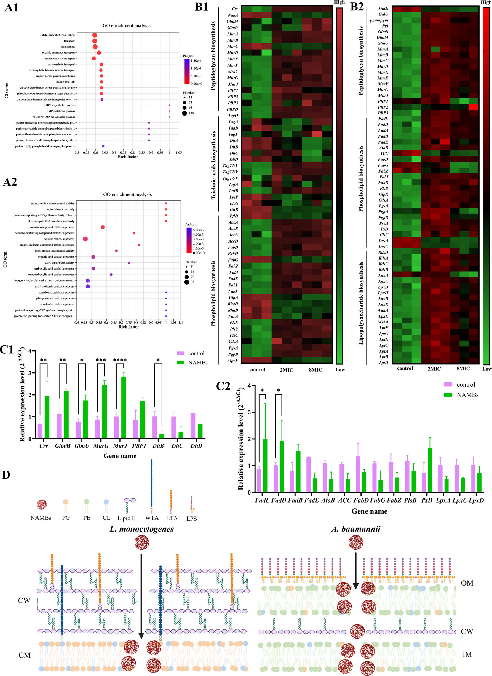 基因表达谱揭示了更深层机制:在李斯特菌中,NAMBs强化肽聚糖层的同时削弱磷壁酸合成,导致碳水化合物代谢紊乱;在鲍曼不动杆菌中,脂肪酸合成关键酶(Acc、FabZ)被抑制,磷脂组成失衡,脂多糖完整性遭破坏。这种“破坏-重建”的动态博弈,最终拖垮细菌的生存系统。