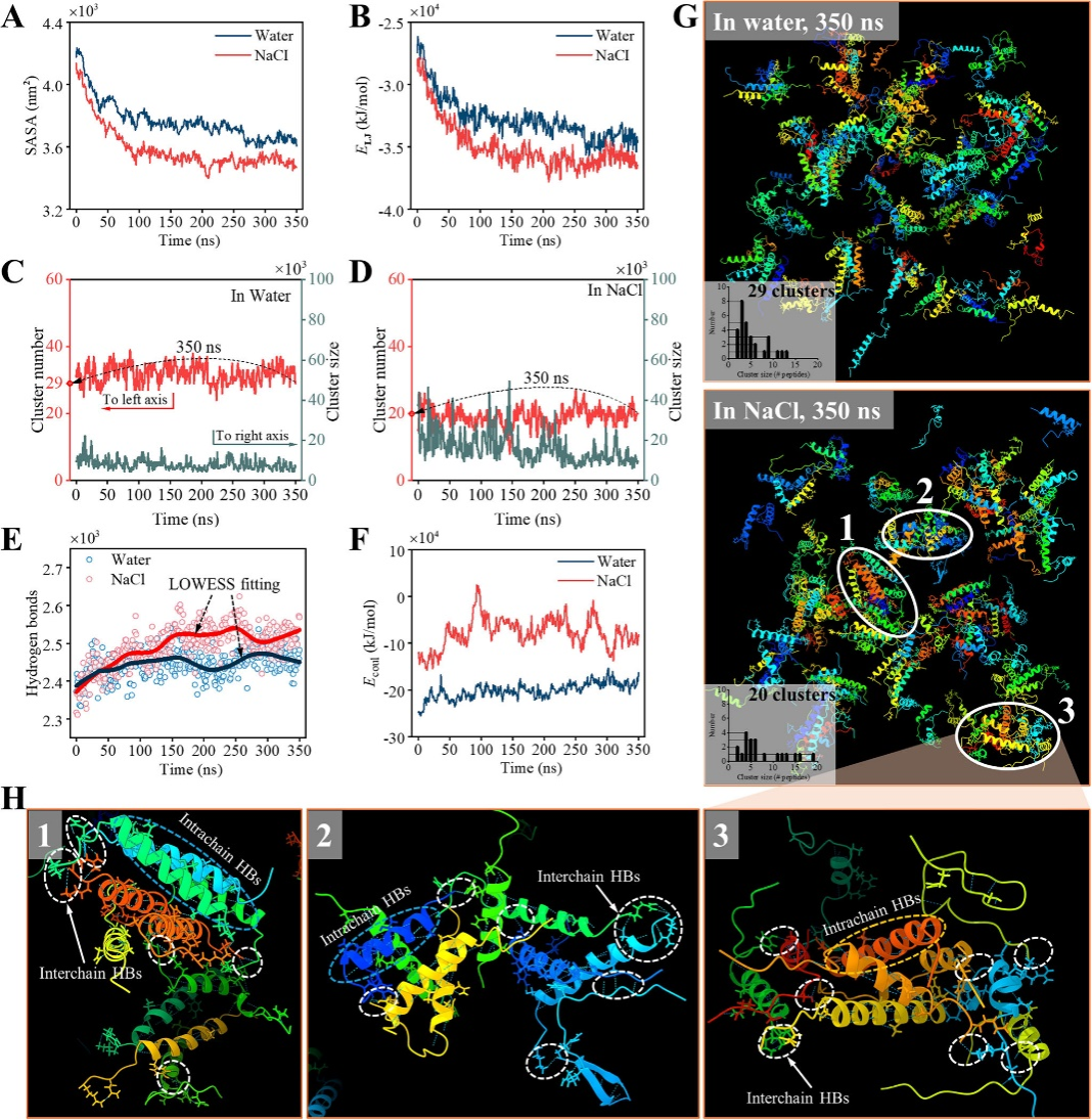图3水溶液与氯化钠溶液中0-350纳秒分子动力学模拟的肽聚集动力学、热力学及结构分析