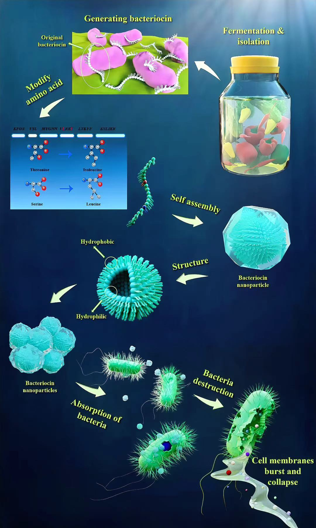 图1概要示意图。该示意图展示了源自发酵食品泡菜中乳酸菌(LAB)的细菌素的整体概况,涵盖多个关键方面,包括细菌素的生成、修饰、结构、自组装成纳米颗粒的过程,以及细菌素纳米颗粒的抗菌机制