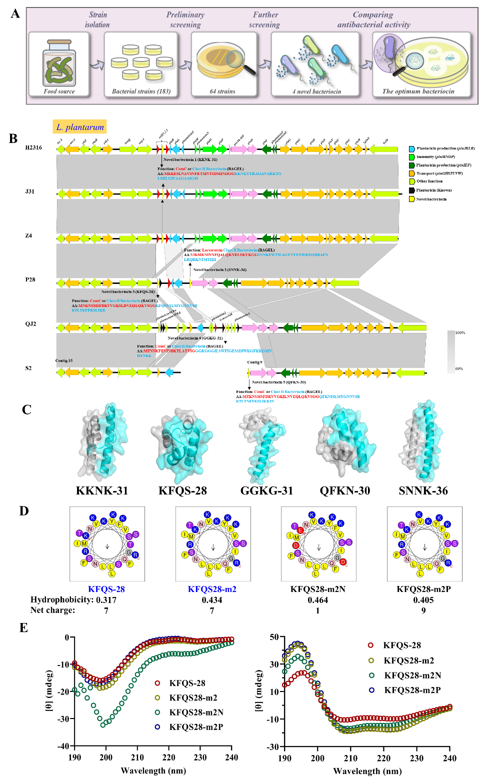 研究团队从36种传统发酵食品(如泡菜、豆腐乳)中分离出183株乳酸菌,最终锁定多株产抗菌活性物质的植物乳杆菌。通过全基因组测序与生物信息学分析,研究者鉴定出多种全新的细菌素分子,并筛选出一种抗菌活性最优的候选细菌素(KFQS-28)。通过理性氨基酸替换:将丝氨酸改为亮氨酸、苏氨酸改为异亮氨酸,提高其疏水性,获得了改良型细菌素KFQS28-m2。