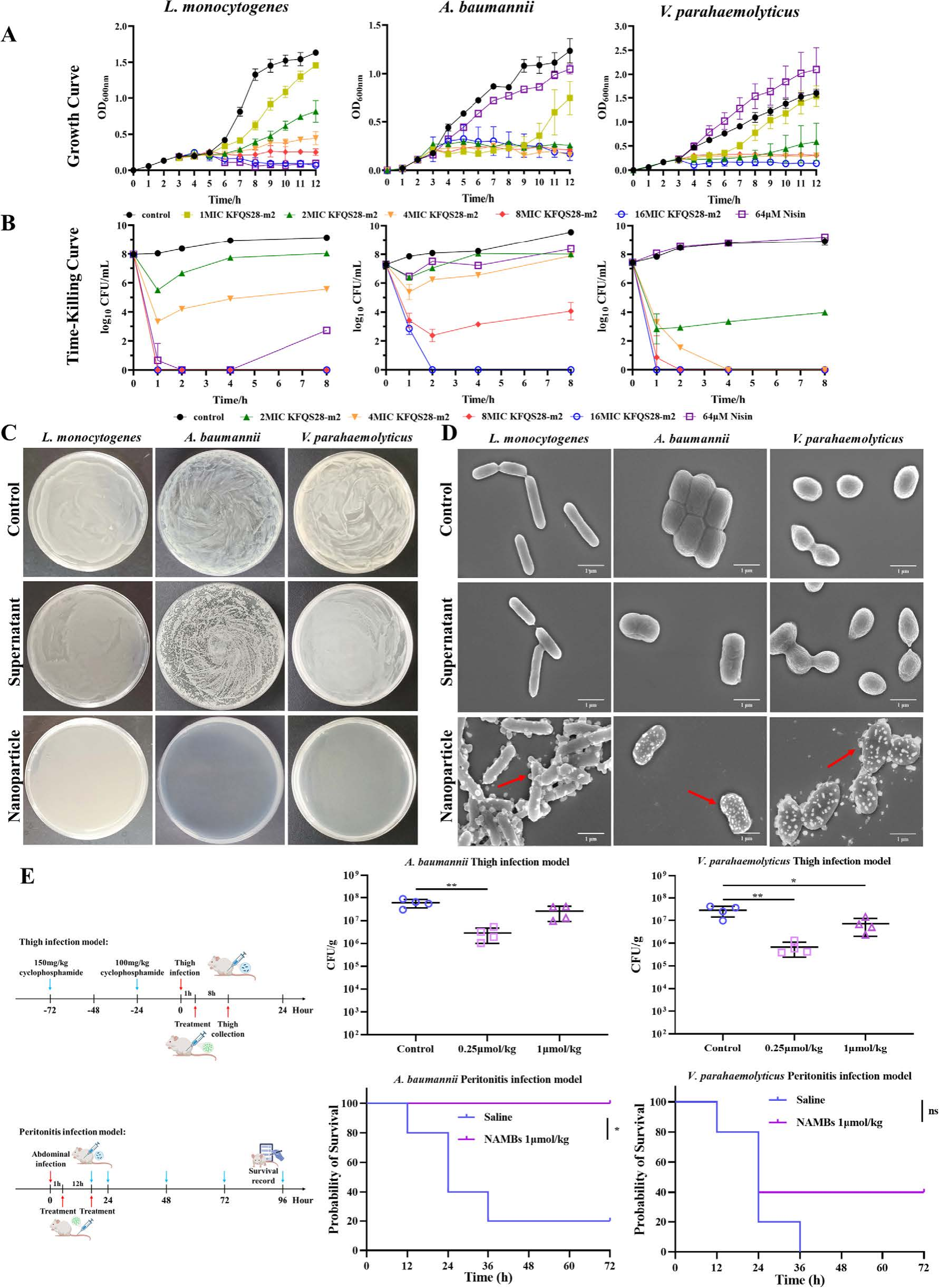 在体外实验中,NAMBs具有广谱抑菌活性,包括抑制单核细胞增生李斯特菌(革兰氏阳性)、鲍曼不动杆菌和副溶血弧菌(革兰氏阴性)。离心分离实验证明抗菌活性完全来自纳米颗粒本身——沉淀物(自组装的纳米颗粒),而上清液(残留的未组装分子)几乎无效。