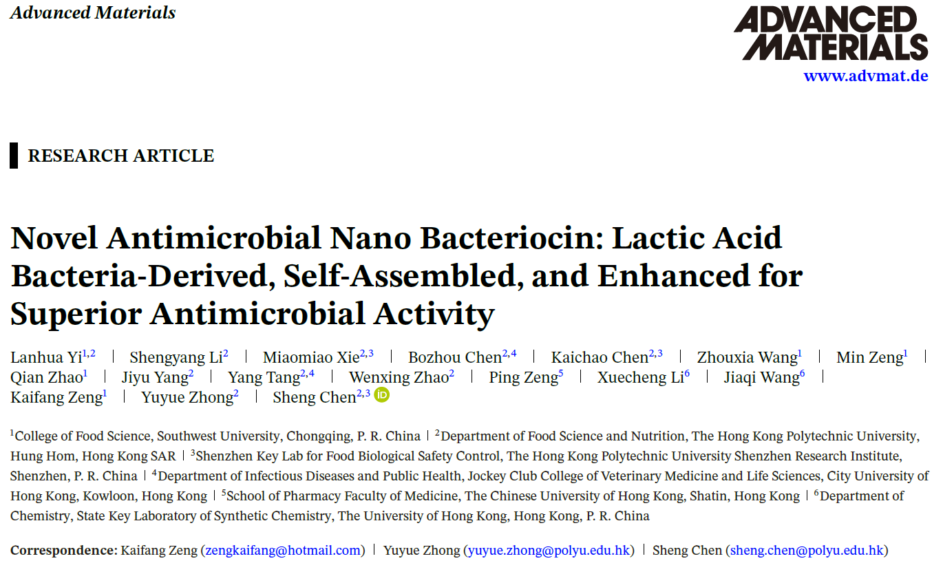 Lanhua Yi, Shengyang Li, Miaomiao Xie, Bozhou Chen, Kaichao Chen, Zhouxia Wang, Min Zeng, Qian Zhao, Jiyu Yang, Yang Tang, Wenxing Zhao, Ping Zeng, Xuecheng Li, Jiaqi Wang, Kaifang Zeng*,Yuyue Zhong*,Sheng Chen*.Novel Antimicrobial Nano Bacteriocin: Lactic Acid Bacteria-Derived, Self-Assembled, and Enhanced for Superior Antimicrobial Activity.Advanced Materials, 2026, 0: e11782.