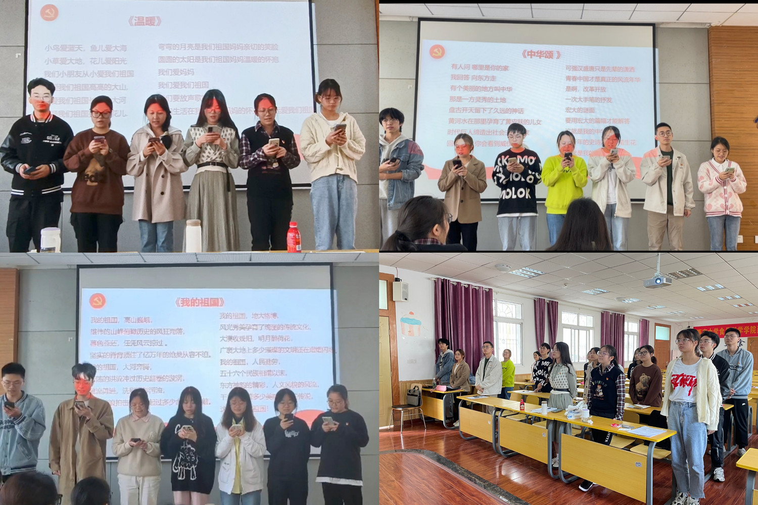 随后,在朱容同志的主持下,举办了“以爱为题,歌颂祖国”的支部特色诗歌朗诵活动。通过报数的方式将参会成员随机分为3个小组后,第三组为大家带来诗朗诵《我的祖国》,对祖国母亲的赞美以及热爱之情感染了其他在场的每一位同志。接着第二组和第一组分别带来诗朗诵《温暖》和《中华颂》,在大家饱含深情的朗诵下,对祖国满腔的热忱以及永远跟党走的坚定信念展现得淋漓尽致。最后,全体党员同志起立合唱《我和我的祖国》,本次党日活动也在悠扬的歌声中落下帷幕。