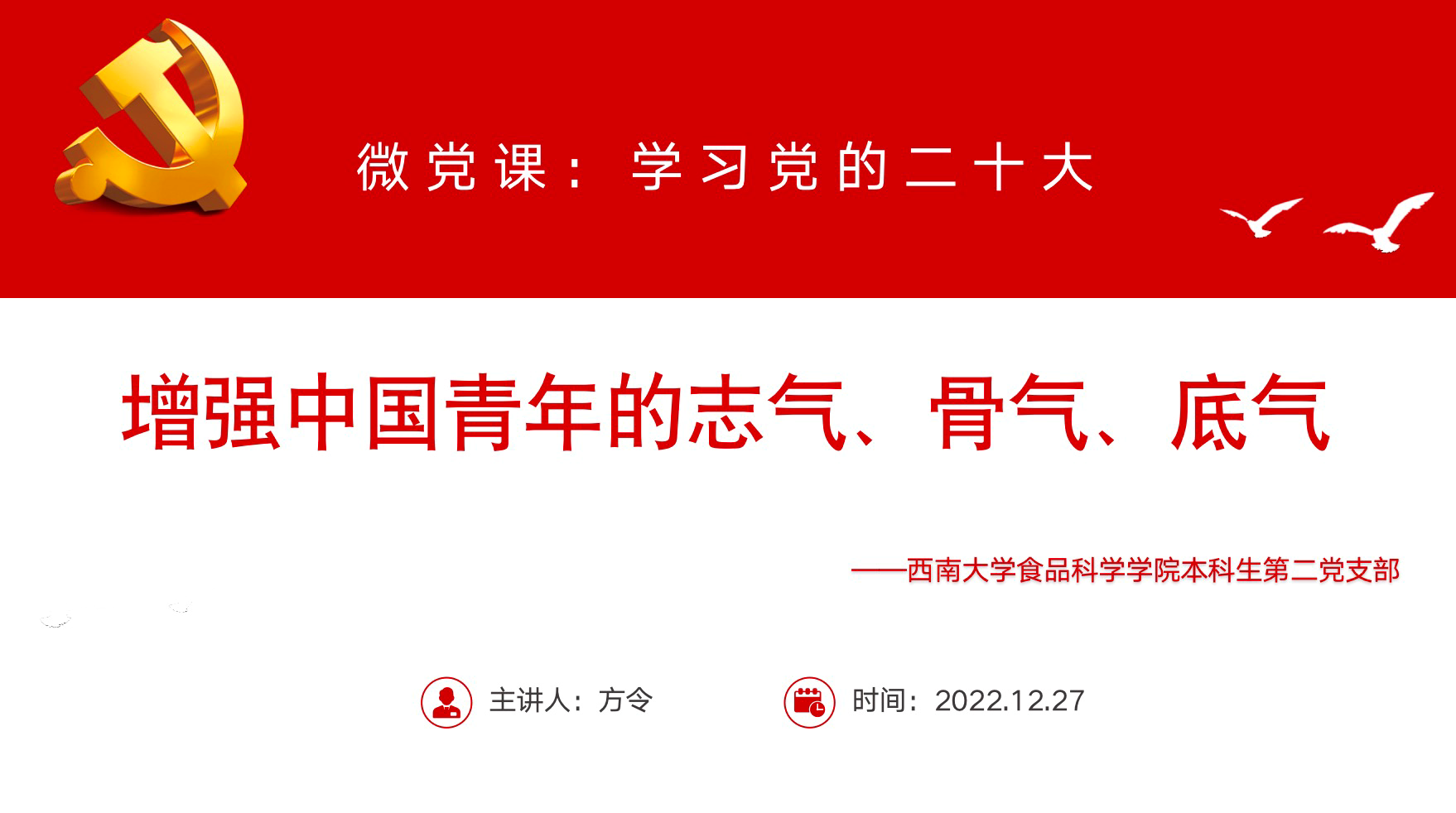 2022年12月27日下午,西南大学best365英国在线体育官网本科生第二党支部以腾讯视频会议方式开展了“学习贯彻党的二十大精神,增强建设特色鲜明世界一流大学的使命担当”主题党日活动,西南大学best365英国在线体育官网本科生第二党支部书记方令同志在这次大会上给大家讲了一堂关于“增强中国青年的志气、骨气、底气”的微党课,生动形象的向大家阐述了如何做一名符合时代发展的“中国青年”。