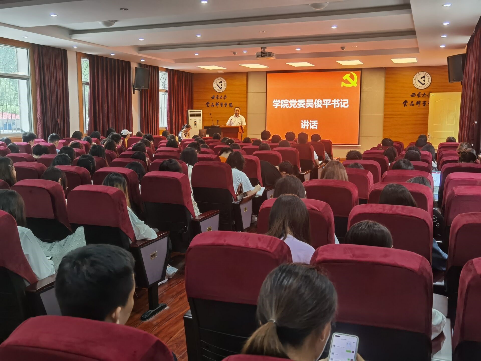 在全体党员齐唱国歌声中,会议正式开始。首先,蔡亚文同志带领全体党员重温了入党誓词,更加坚定了大家为共产主义奋斗终身的决心。接着,党委书记吴俊平发表讲话,他指出毕业生党员要牢记党员身份,充分发挥模范带头作用,他对毕业生党员提了四点要求:一是要不断提高政治素养;二是要不断学习理论知识;三是要提高品德修养,爱岗敬业;四是要提高就业本领。随后,优秀毕业生党员张东同志向我们讲述了他在党的培养下,如何以实际行动践行初心使命的过程。