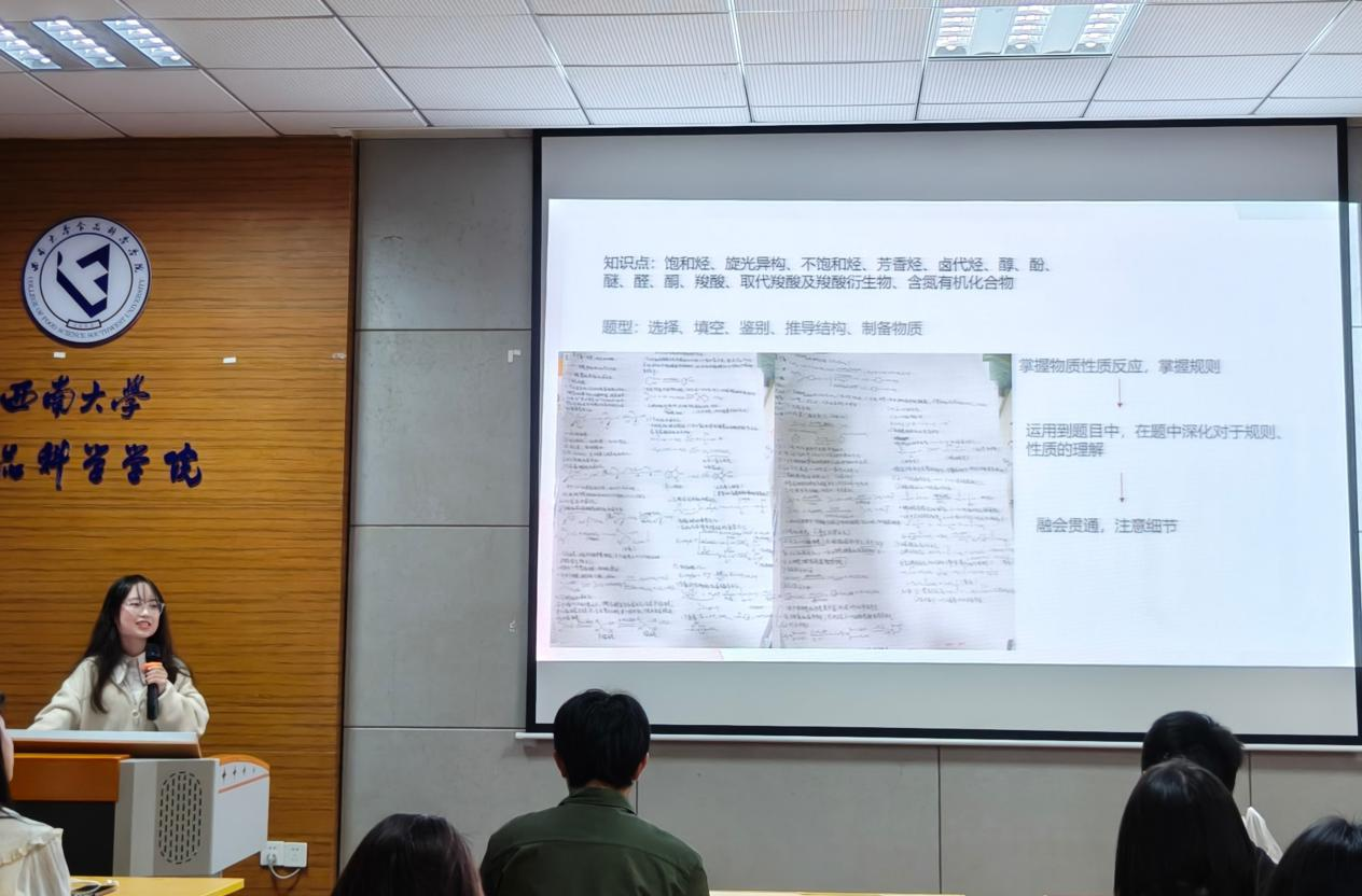 随后,吴玉具体介绍和强调突出了普通化学、有机化学的重难知识点,还为同学们讲解了拥有正确学习方法的重要性,分享了期末突击复习的诀窍与妙招。除此之外,吴玉还向同学们分享了一些有效获取学习资料的途径,助力同学们更好地完成学业。
