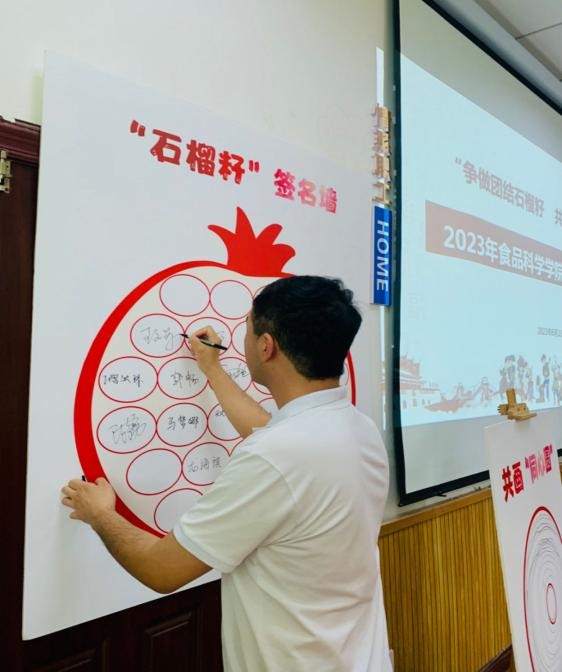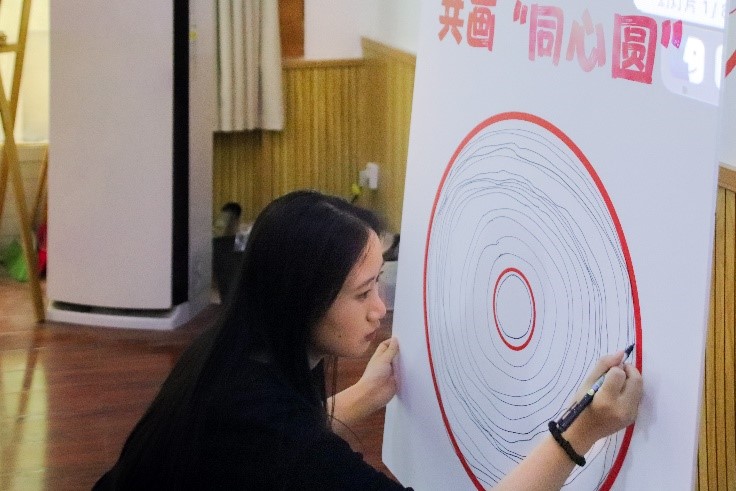 会前,参会师生一起在“石榴籽”签名墙上签名,并共同绘制民族“同心圆”。在观看完《美丽中国》视频后,穿青人族、藏族、布朗族、维吾尔族、回族、蒙古族的6名学生代表向大家分享了各自民族的风俗习惯和风土人情,并通过现场教学的方式带领大家学习了少数民族语言,让大家感受到了少数民族的魅力。