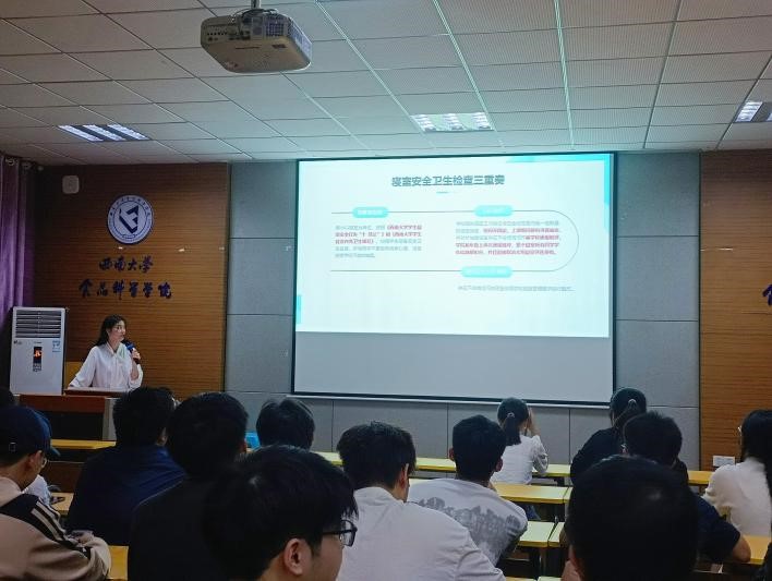 本次会议涵盖寝室规范化管理、寝室安全卫生抽查情况、寝室文化建设工作畅想三方面内容。首先,夏雪带领全体寝室长再次集中学习并解读《西南大学学生寝室安全行为“十禁止”》和《西南大学学生寝室内务卫生规范》,要求各寝室长严格按照文件对寝室成员做好管理。随后,夏雪用图文并茂的方式详细说明寝室安全卫生检查存在的常见问题,各寝室要加强寝室内务卫生、寝室违规电器使用、寝室挂牌等,发现问题及时向辅导员反馈。最后,全体寝室长们以小组为单位进行头脑风暴,积极思考“如何更好地构建寝室文化”,现场各小组讨论激烈,各抒己见,分别从寝室卫生安全、学习、日常生活、学生工作、社会实践等各方面提出意见。