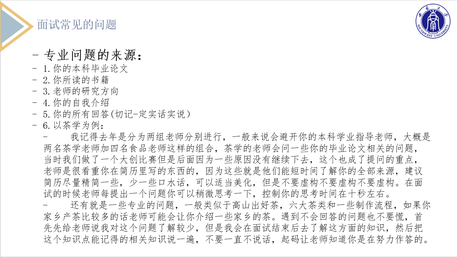 持续“经验分享会”,做好就业升学的“领航员”。2023年3月,在线上进行了就业和考研复试专场分享会。就业会场邀请了在涪陵榨菜集团、中国农业银行、江西省赣州市寻乌县长宁镇人民政府工作的往届毕业生宣讲。3位往届毕业生从备考、简历制作、面试、选岗、主要工作内容等多个方面进行了分享。考研复试会场邀请了目前就读于中国农业大学、西南大学等高校的4名研究生进行宣讲,他们主要围绕复试流程、复试内容、注意事项等方面进行了分享。
