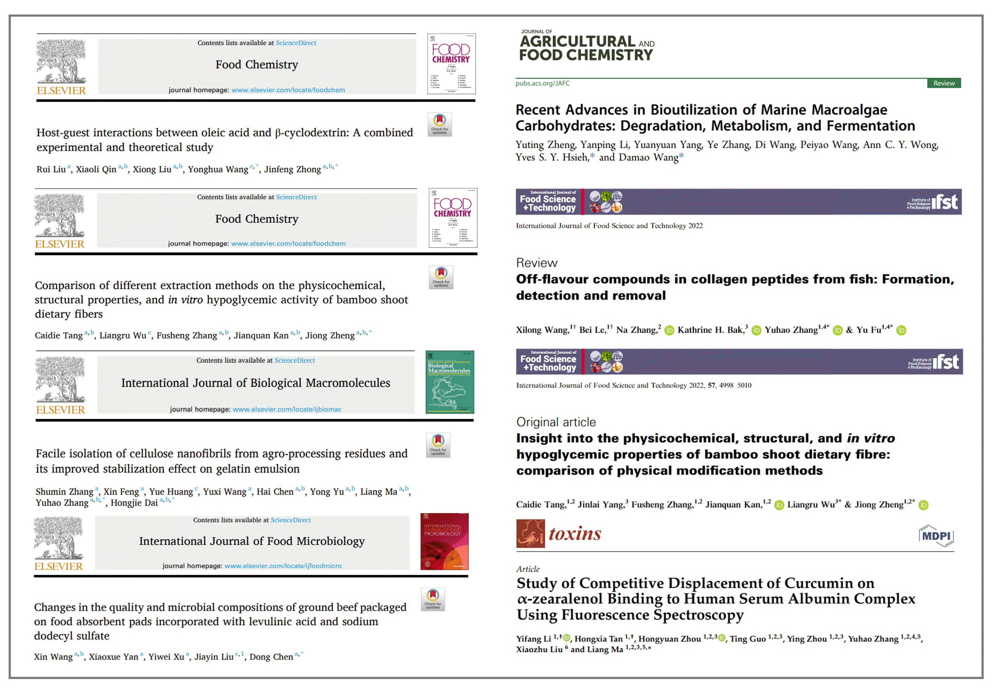 2019级百超班的学生自大二第一学期开始在学业导师的指导下进入实验室参与科研,目前已在论文发表方面取得丰硕成果。截止2022年10月,已有11名同学以第一作者在国内外食品主流期刊如《Journal of Agricultural and Food Chemistry》《Food Chemistry》《International Journal of Food Microbiology》《International Journal of Food Science and Technology》《International Journal of Biological Macromolecules》《Toxins》《食品与发酵工业》《中国粮油学报》等发表18篇学术论文,其中SCI论文8篇(一区5篇),CSCD核心论文6篇。
