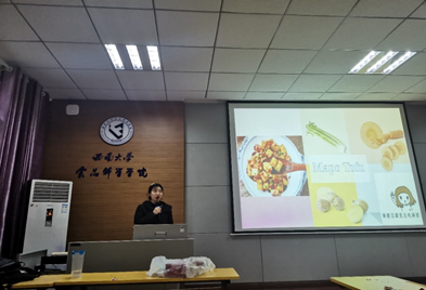 随后,2018级百超班史文婧和黄颖玉同学为大家带来了中华传统美食——北京烤鸭和麻婆豆腐的介绍。流利的英语口语和详细的美食介绍展现了同学们优秀的知识水平素养和对中华传统美食的独特理解与热爱。最后是游戏环节,面对一些有关中外美食的小常识提问,大家踊跃抢答。游戏让我们意识到要做生活的有心人,要养成细心观察,仔细思考的好习惯。