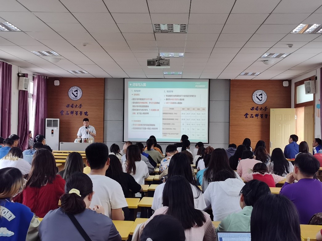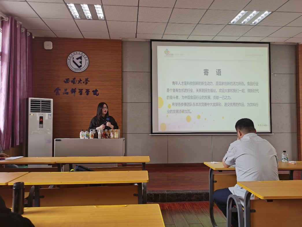 中国食品科学技术协会代表于洋高级工程师在宣讲会上向师生们介绍了中国食品科学技术协会的由来,通过视频播放转达了院士们对学子们的殷殷期盼,并向同学们详细地介绍了本次茶饮料大赛的流程及其相关事宜,希望各位参赛学生能在本次竞赛中充分发挥创新能力,收获胜利果实。宏胜集团恒枫食品科技公司总经理陈佳向师生们介绍了宏胜集团的发展历史,向参赛学子分享了一些宝贵经验,并祝愿各参赛团队都能在本次竞赛中大放异彩,递交优秀作品,为茶饮料行业的发展添砖加瓦。