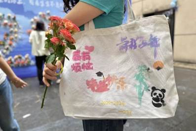 入场前,学院为毕业生特别设计了DIY毕业帆布包、鲜花签名墙、冷餐会、照片墙打卡四个体验环节。独具匠心的伴手礼紧扣“毕业”的主题,为晚会增添了一份仪式感。