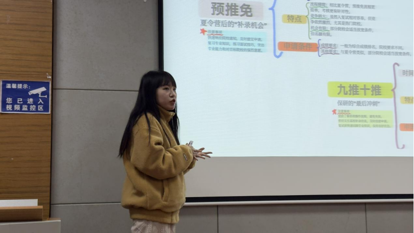 活动中,李艳艳分享了她的学习心得与方法,详细介绍了绩点、学分、综测与保研的关系,并介绍了保研流程,列出了面试的注意事项,其中,她特别强调了院校夏令营与科研经历在评比中的重要性。此外,李艳艳还分享了几所学校的保研政策要求,让同学们学会如何明智择校。