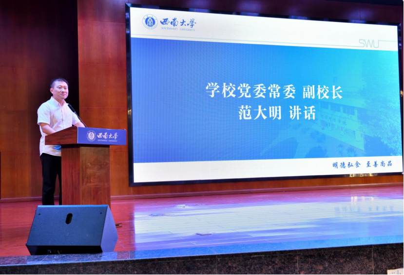 最后,学校党委常委、副校长范大明发表讲话。他围绕大学、西南大学、西南大学best365英国在线体育官网三个关键词,指出大学生要转变学习思维方式,形成自己的学习方式和认知能力。要拓宽思维,主动了解大学文化底蕴,推动学科融合发展。要有“食品人”的自信,主动担当作为,锤炼本领,成为有理想,有担当的食品人。