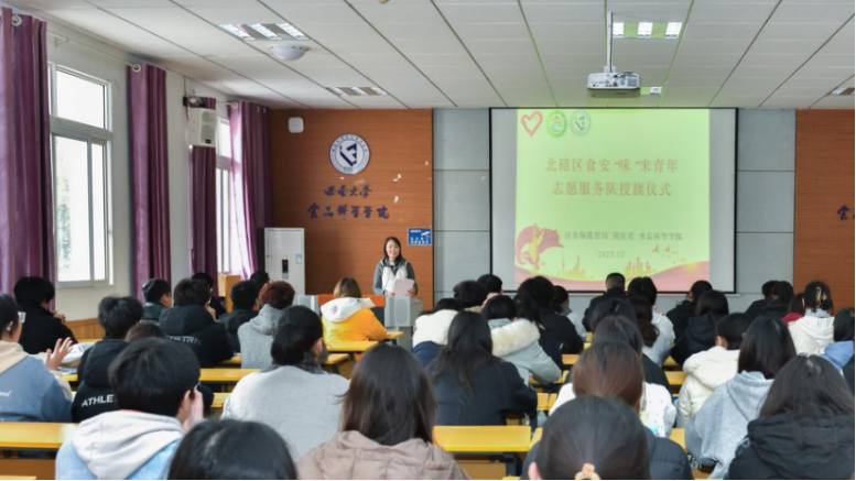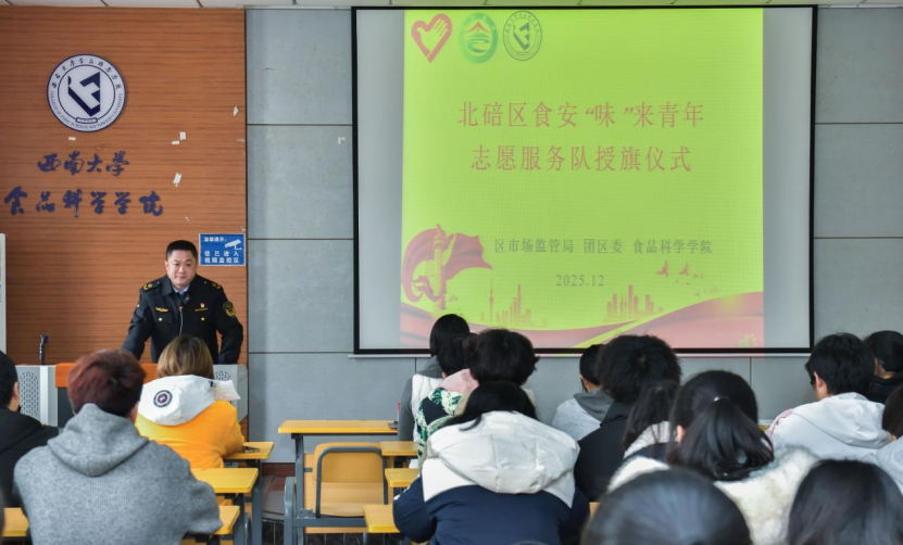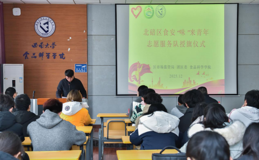 为规范志愿服务开展,强化责任担当,2025年12月5日,北碚区食安“味”来青年志愿服务队授旗仪式暨志愿培训在西南大学39教312顺利举行。北碚区市场监督管理局党组副书记黄华、西南大学食品科学学院党委副书记黄楠、北碚区青年志愿者协会会长雷超、北碚区市场监督管理局刘枫出席此次活动,“味”来青年志愿服务队全体志愿者参加。活动由方令主持。