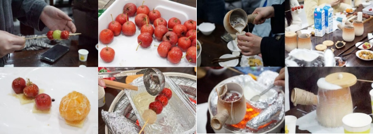 随后的手作与实操环节精彩纷呈。同学们兴致勃勃地动手制作糖葫芦,酸甜可口的手作成果让现场充满欢声笑语。紧接着,大家分组尝试煮制藏式酥油咸奶茶糯米桂花烤奶特色养生奶茶,各组成员分工协作,在亲手操作中体会着煮茶的乐趣与传统技艺的魅力。