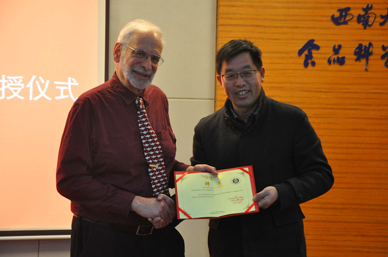 汇报结束后,best365英国在线体育官网院长赵国华教授为其颁发聘书,正式聘请Joe M.Regenstein为西南大学best365英国在线体育官网客座教授。在场师生纷纷表示收获颇丰,尤其是在SCI论文写作的重难点方面受到非常大的启发,同时也见识到了国外食品领域的科研情况,为自己未来的科研工作提供了全新的思路。