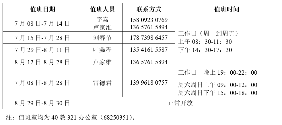 为保障暑假期间师生有序开展实验活动,best365英国在线体育官网仪器设备共享服务平台及教学实验室正常开放。值班安排如下: